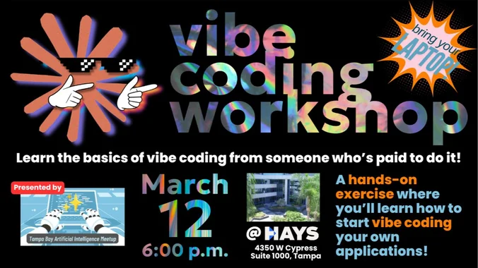 If you’re curious about vibe coding and want to know how to get started, bring your laptop to Tampa Bay AI Meetup’s Vibe Coding Workshop, taking place on Thursday, March 12 at 6:00 p.m. at the Hays office (4350 W Cypress, Suite 1000, Tampa)! We’ll help you get started with a couple of vibe coding exercises, including building a Chrome plugin that you’ll find useful for vibe coding.